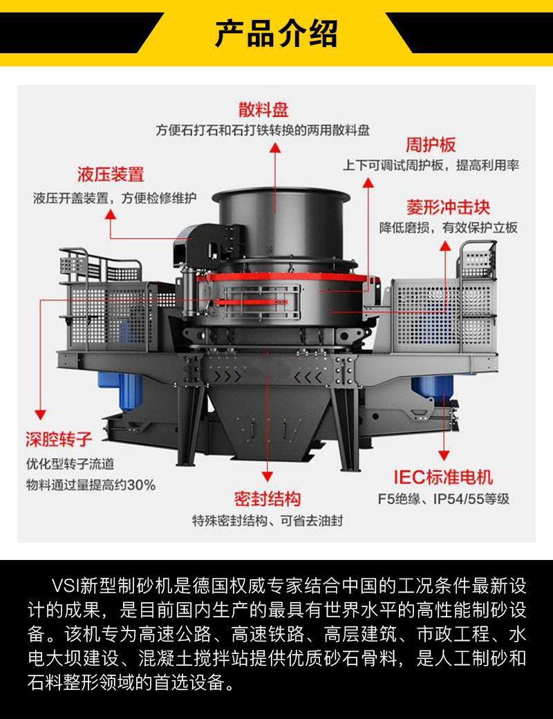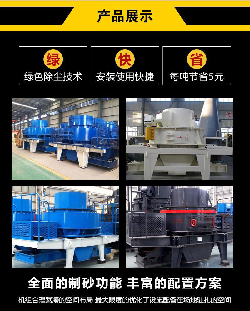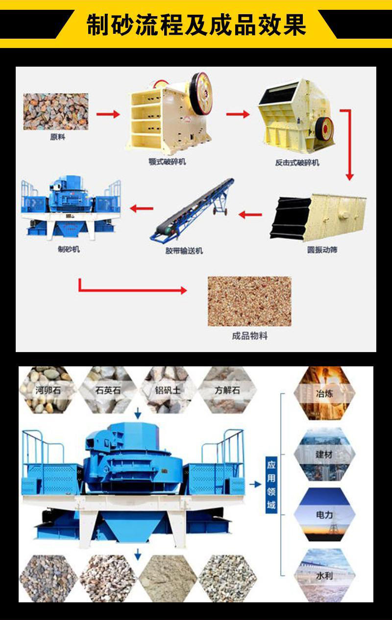 【应用范围】:工程领域的水利水电、高速公路、桥梁、市政工程、高层建筑的机制砂生产和石料整形。矿业领域的磨矿前段细碎工艺,玻璃、石英砂和其他高纯度材料的生产。