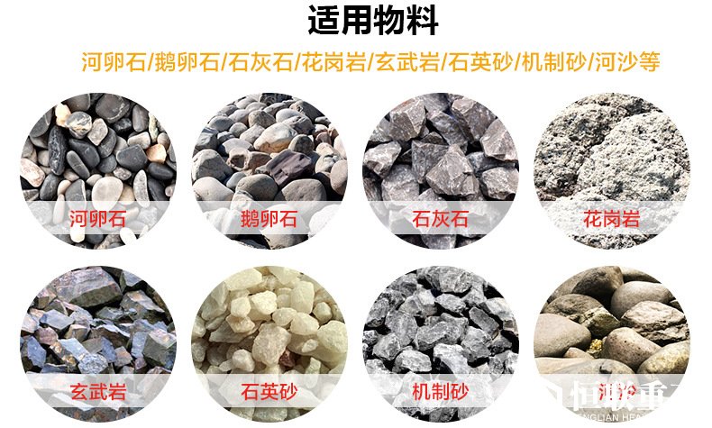 【适用物料】:河卵石、鹅卵石、石灰石、花岗岩、石英砂、自然砂、机制砂、河沙等。