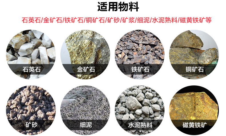 【适用物料】:石英石、金矿石、铁矿石、铜矿石、矿砂、矿浆、细泥、水泥熟料、磁黄铁矿等。