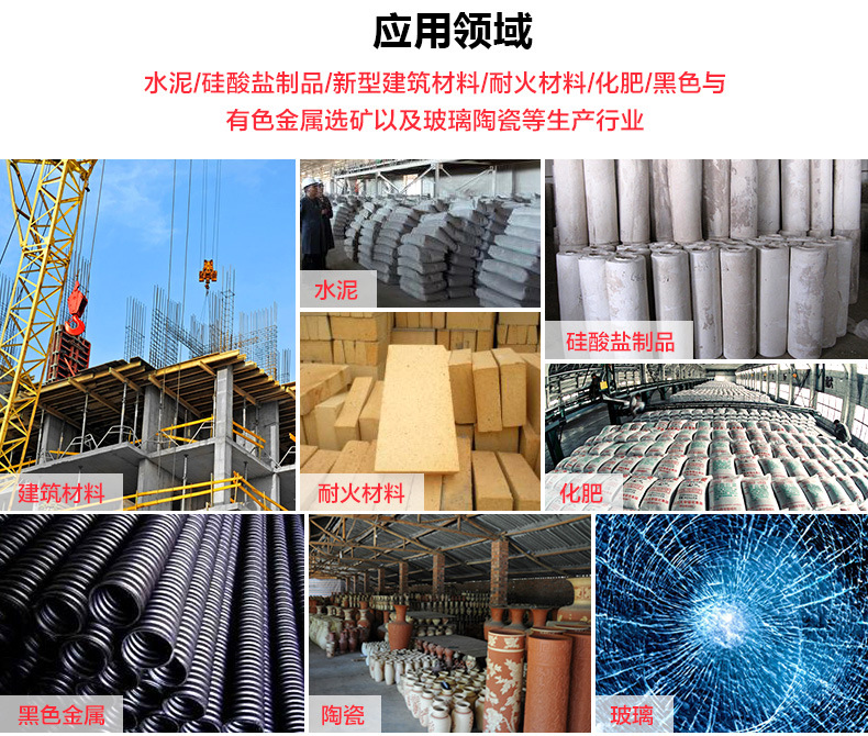 【应用范围】:水泥,硅酸盐制品,新型建筑材料、耐火材料、化肥、黑色与有色金属选矿以及玻璃陶瓷等生产行业。