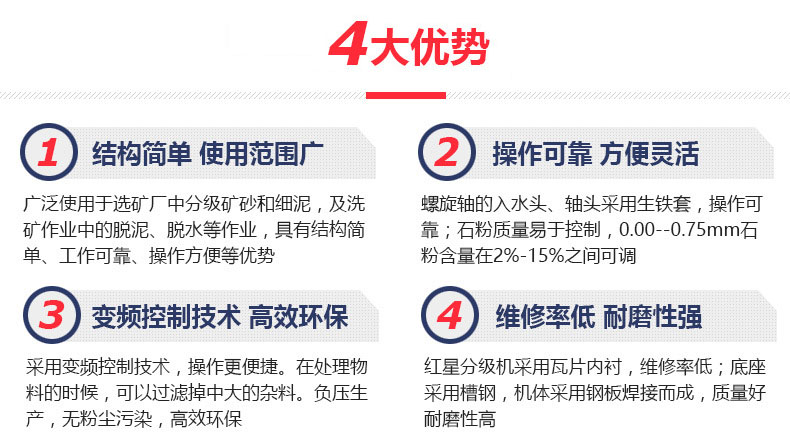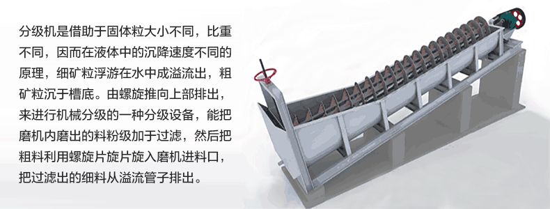 螺旋分级机是选矿的设备之一,螺旋分级机借助固体颗粒的比重不同,因而在液体中沉淀的速度不同的原理,进行机械分级的一种设备。