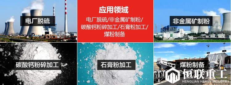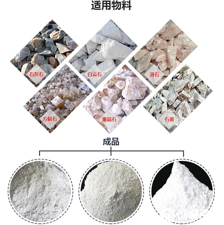 【应用范围】:适用于重晶石、方解石、钾长石、滑石、大理石、石灰石、陶瓷、玻璃等莫氏硬度不大于 7 级,湿度在6%以下的非易燃易爆的矿业、化工、建材、冶金等行业 280 多种物料的制粉加工,成品粒度在 100 - 425 目范围内任意调节