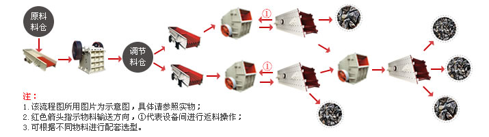注:当进料小于等于300mm时,物料直接进入欧版反击破破碎,不用前面的第一段破碎。